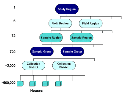 Data Analysis Australia developed a hierarchy of zones that ultimately divided the Perth region into 720 workable fieldwork areas, termed Sampling Groups. The entire study region was first separated into six Field Regions recognising natural boundaries such as the Swan River and the freeways. Each Field Region was then separated into 12 Sample Regions, each of which were further separated into 10 regions, forming the 720 Sampling Groups. This process generated sampling groups of a size that was reasonably cost effective whilst maintaining good levels of sampling efficiency. Over the four years, each Sampling Group was sampled at least once, so that every household in Perth had a chance of being selected in the survey.